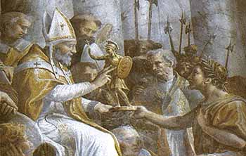 Mucha gente desconoce que hasta precisamente este momento, en el año 800, el obispo de Roma era uno más entre los demás (jeroglífico:losdemás1+losdemás), que la figura del Papa, tal y como la conocemos en la actualidad, es mucho más reciente de lo que creemos. Poco importaba que fuese sucesor o no de San Pedro, que el Espíritu Santo lo escogiera de entre los príncipes de la Iglesia o que fuera un Santo, Santo Padre… Los motivos metafísicos debían de ser bastante poco prácticos para los teólogos de la época y decidieron buscar una justificación más pragmática: todo un emperador romano había decidido en su última voluntad que el romano fuese el primero entre los obispos. Y es que la Iglesia siempre ha tenido muy buena mano en este negocio de la Arquitectura… Esto de la Donación Constantiniana les ha permitido coronar reyes y emperadores durante siglos, hacer y deshacer en la arquitectura de la política internacional.