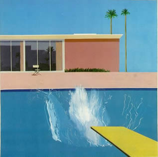 Quizás su cuadro más conocido de este periodo sea A Bigger Splash. Una composición sencilla, a base de líneas planas. Un trampolín, una piscina, una moderna y sencilla vivienda de una planta, el cielo azul y luminoso y dos palmeras que rompen la horizontalidad. Todos elementos secundarios y accesorios que no logran distraernos del verdadero protagonista de la obra. ¿Una persona? No la vemos. Está zambullida debajo del agua. Pero ha dejado su huella en la superficie, un gran «splash».