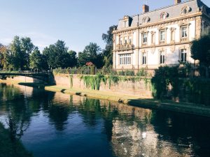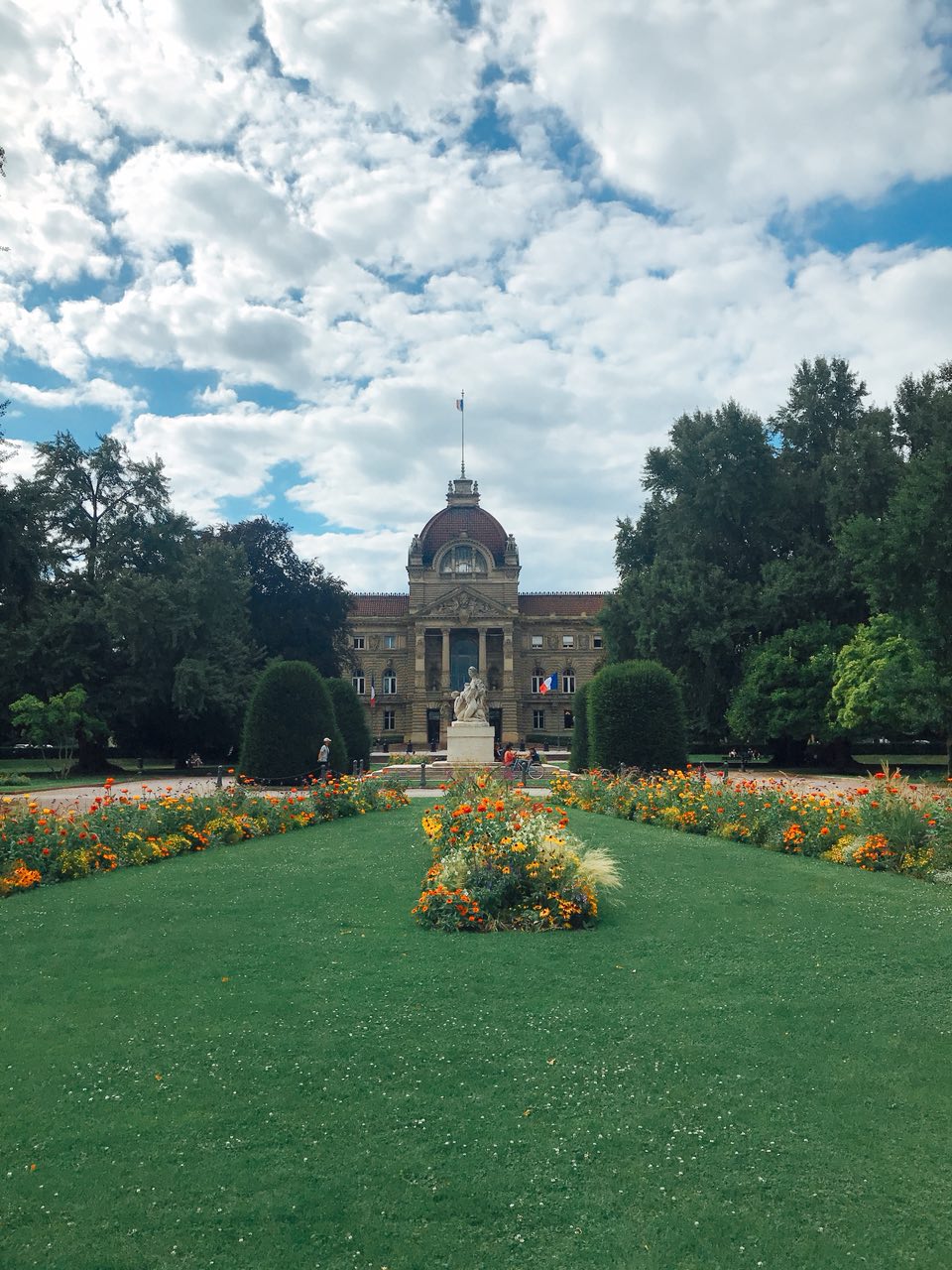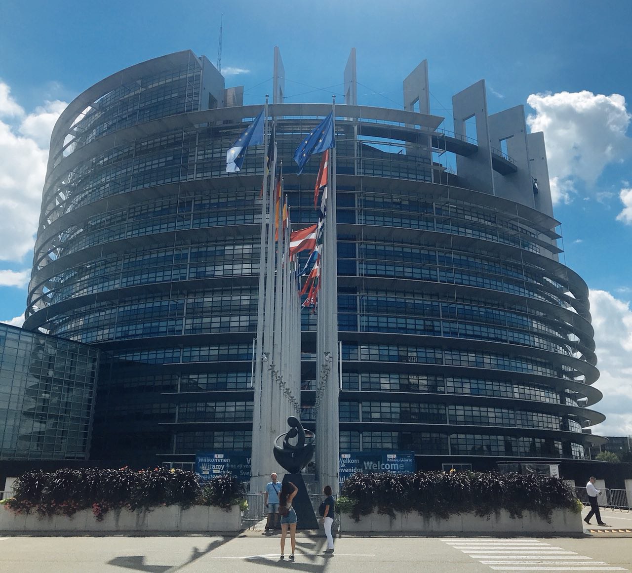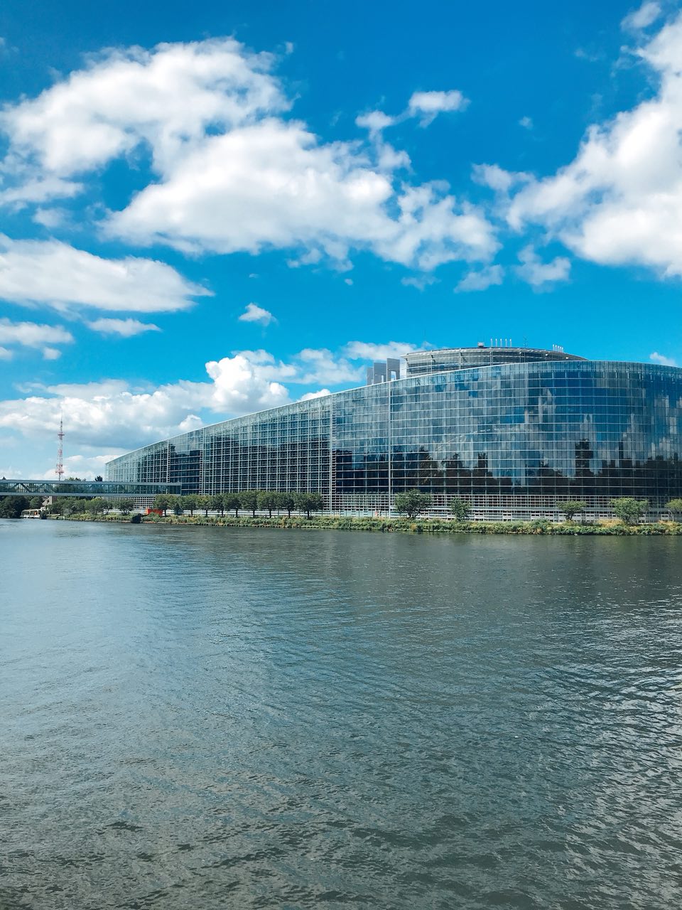 La tercera zona que te propongo visitar es el Barrio Europeo que está un poco alejada del centro pero merece la pena ir. Puedes llegar en tranvía (línea E hasta Parlamento Europeo o Derechos Humanos), en taxi o en Uber. La ciudad comparte con Bruselas la sede del Parlamento Europeo. El impresionante edificio del hemicilo se levanta junto al río Ill.