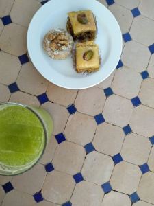 Y quería terminar mi post con este «bonus track» que para nosotros fue un gran descubrimiento del viaje. Justo a los pies de la Alcazaba está la Tetería Almedina Baraka, en un precioso edificio decorado espectacularmente, con un patio precioso y una terraza con vistas. Nosotros tomamos una limonada con dulces marroquíes pero también hay un restaurante con muy buena pinta.