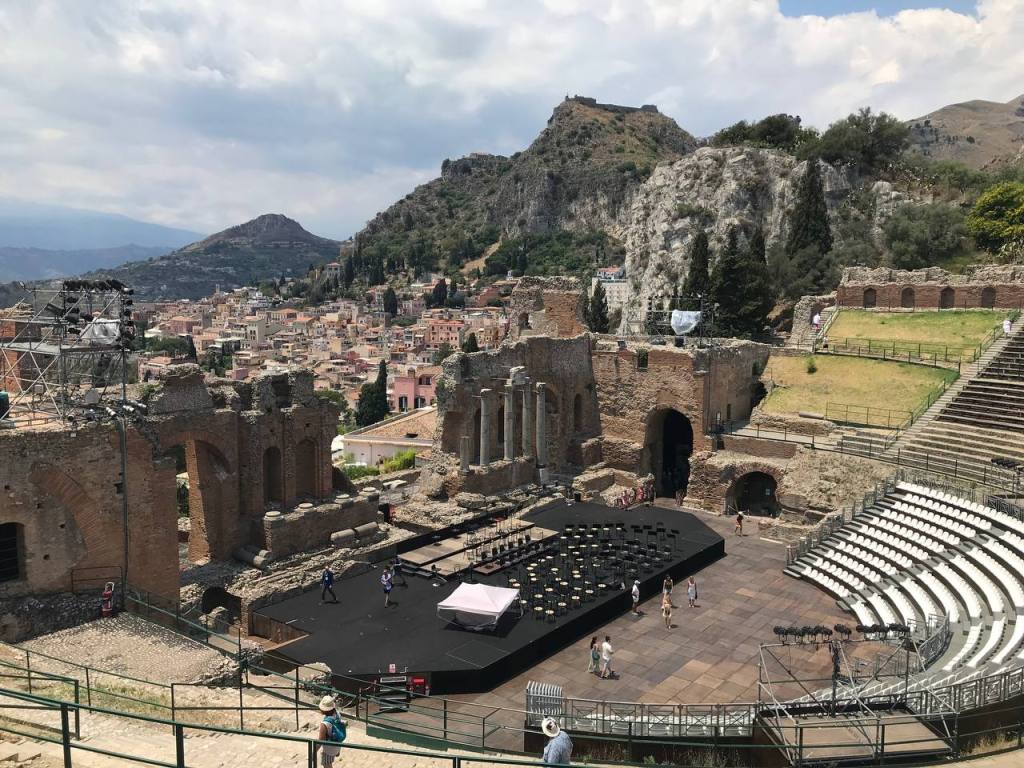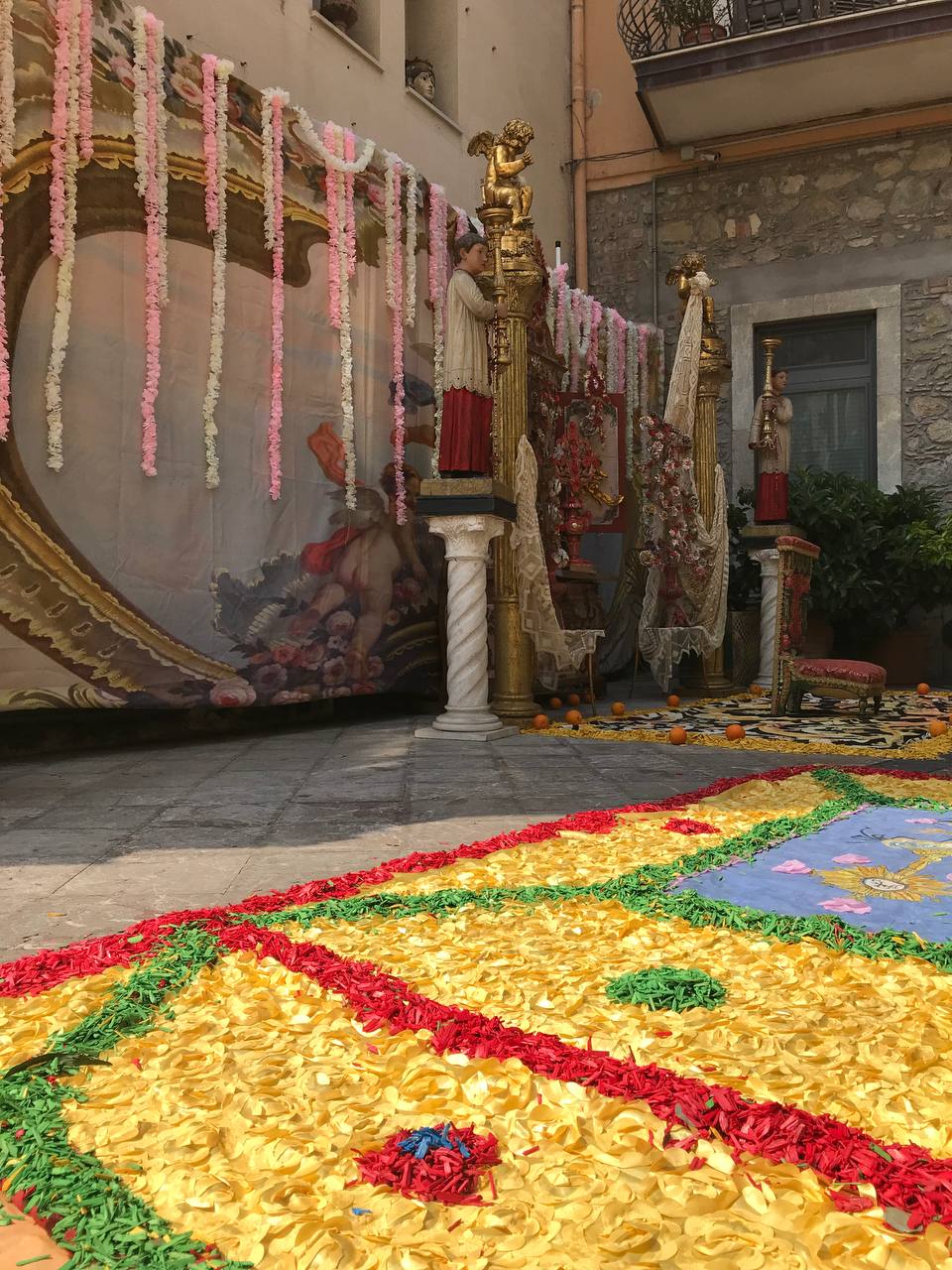 A menos de 1 hora de coche de Catania está Taorimina a la que también se puede llegar en tren con un viaje de hora y media. Es una ciudad muy turística, pero vale muchísimo la pena visitarla. Aparcar gratis en ella es imposible. Nosotros aparcamos en el parking Lumbi y tomamos el autobus gratuito que sube a la ciudad monumental. Lo que no te puedes perder es el espectacular Teatro Greco que tiene como fondo de escenario uno de los paisajes más impresionantes de la isla. La entrada vale 10 euros. Después de esta visita obligada solo tienes que dejar llevar tus pasos por el Corso Umberto y te irás encontrando los principales monumentos. Nos gustó el Odeón, un espacio para la música en la Antigüedad que nos pareció una miniatura del Teatro Antico. La Piazza del IX de Aprile no solo ofrece unas espectaculares vistas desde el balcón sino que también acoge una antigua capilla convertida ahora en biblioteca y una coqueta iglesia de San Giusseppe. Continuando el paseo bajo la torre del Reloj se llega a la Plaza de la Catedral, cuya entrada es gratuita. Alejándote un poco de la calle principal está la Villa Comunale un espectacular jardín botánico construido por una británica exiliada en Sicilia que ofrece unas impresionantes vistas de la costa. Además tuvimos la suerte de visitar Taormina durante la fiesta del Corpus Christi pudiendo ver las coloridas alfombras florales con las que se decoró todo.
