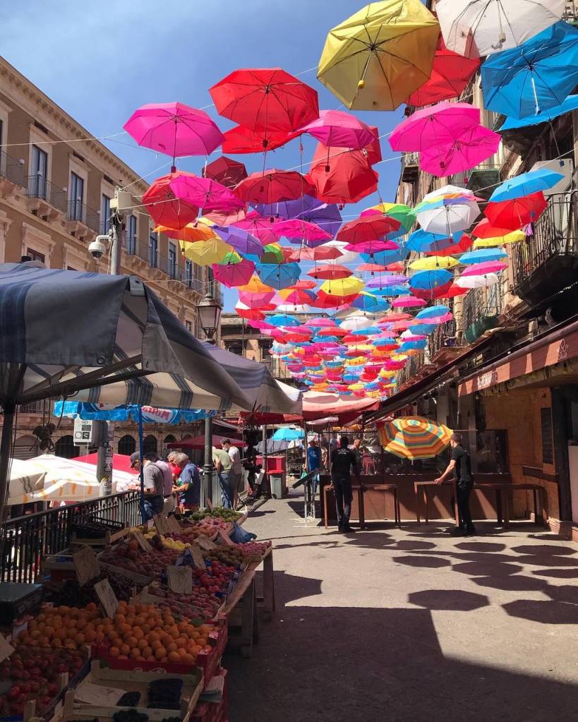 ¿Qué ver en Catania? Nuestra primera imagen de la ciudad fue el Mercado de Pescado de Catania y tenemos que confesar que fue toda una experiencia. Los olores, los colores, la luz, la gente son todo un espectáculo para los sentidos. Algunos puestos están en el interior de la antigua muralla de la ciudad y otros se reparten por la plaza que hay delante bajo un cielo de paraguas de colores. Te recomendamos que vayas a primera hora para verlo e incluso puedes regresar a la hora del aperitivo para probar el producto local: mejillones, sardinas fritas y buñuelos de pescado.