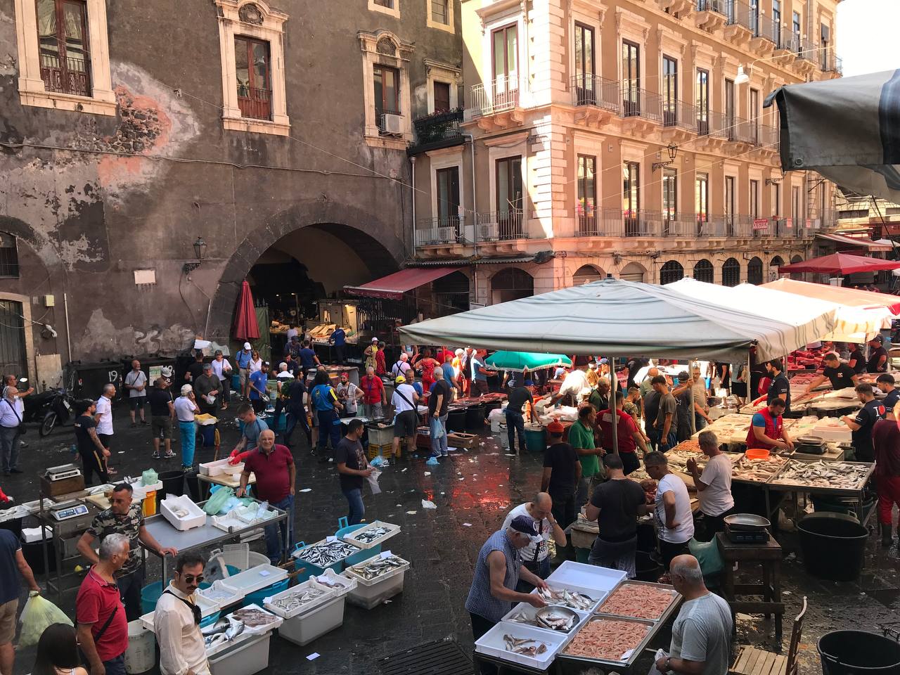 A dos pasos del mercado está la Piazza del Duomo, la más fotografiada de la ciudad. La entrada a la Catedral es gratuita y vale la pena. Su inmensa fachada da paso a un interior muy barroco. También se pueden ver en el interior las ruinas de las antiguas termas romanas. Frente al Duomo y presidiendo la plaza la fuente del Elefante, todo un símbolo de la ciudad. Junto a esta plaza está la Piazza de la Universitá de la que parte la Via Etnea, la calle más comercial que ofrece una perspectiva impresionante del volcán, perfectamente visible desde Catania.