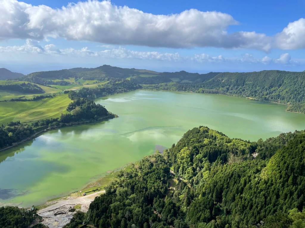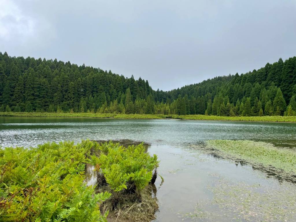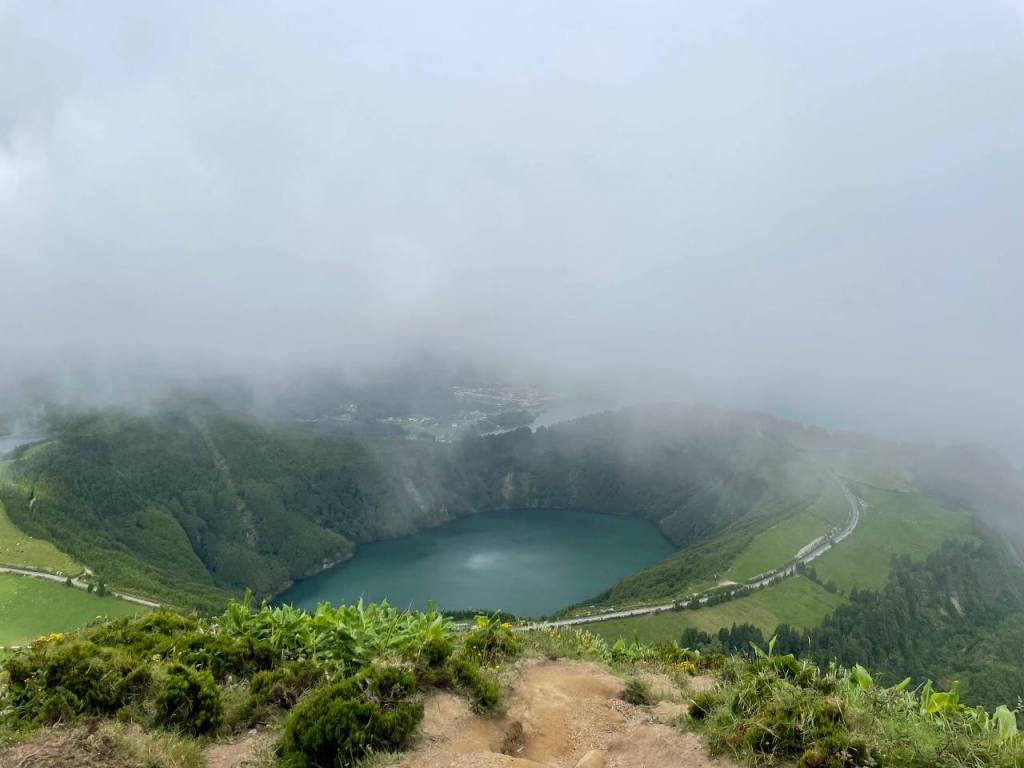 Nuestro primer día completo en la isla lo decidimos comenzar en uno de los lugares imprescindibles de Sao Miguel: la icónica imagen de los lagos de Sete Cidades y toda la explosión de naturaleza que encontrarás en los múltiples puntos de interés que hay alrededor. Tomamos nuestro coche y en menos de 20 minutos estábamos en nuestro primer destino, el Acueducto do Carvao, donde dejamos el coche y cruzamos la carretera. A tan solo 10 minutos caminando te encontrarás la impresionante Lagoa das Empadadas y a continuación la Lagoa de Eguas. Desde este punto comienza una ruta de senderismo que te lleva a Pico do Paul y de allí a Lagoa do Canario, pero nosotros no la hicimos. En nuestro caso tomamos el coche de nuevo para dirigirnos primero al acueducto das Nove Janelas y de allí al parking de Lago de Canario. Desde el parking encuentras un camino cerrado al tráfico que te dirige primero a la laguna y luego al Miradouro da Grota do Inferno y aquí es donde entró en escena uno de los enemigos de nuestro viaje: la niebla. Este y otros miradores están a gran altitud y en muchas ocasiones la niebla te estropeará las vistas. Nos habían hablado de las web cam en directo que te dan pistas de si vas a encontrar o no niebla. Nuestra experiencia en Gruta del Infierno, sin embargo, fue que la paciencia es la madre de la ciencia… Aunque llegamos al mirador con una niebla cerrada solo tuvimos que esperar unos minutos para que las nubes se despejaran y nos dejaran ver algunas de las lagunas, como la de Santiago, desde arriba.