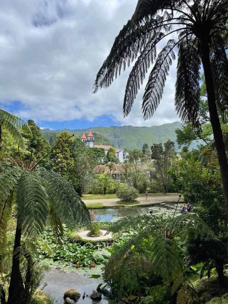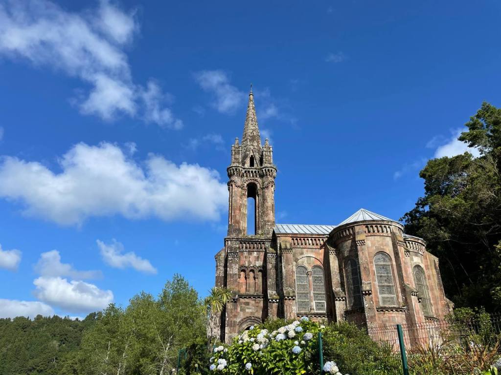 Ya muy relajaditos después del baño en el jacuzzi decidimos explorar el otro lado de la laguna. Cuando llegamos a este parking esperábamos pagar igual que en lado de las fumarolas, pero como eran casi las 18 horas nos encontramos con acceso gratuito. Dimos un paseo por ese lado del lago y admiramos la arquitectura neogótica de la Capilla de Nuestra Señora de las Victorias y de las casas que se asoman al lago desde fuera. Junto a la capilla está el acceso a otro jardín botánico, José do Canto, que no tuvimos tiempo de visitar.