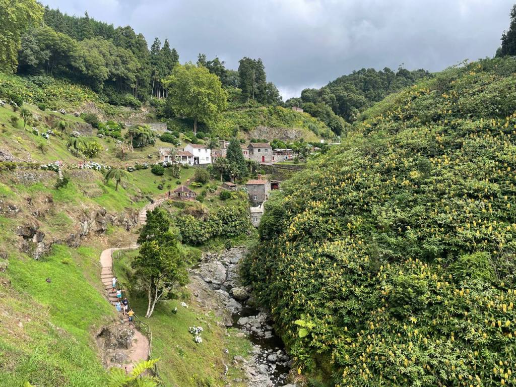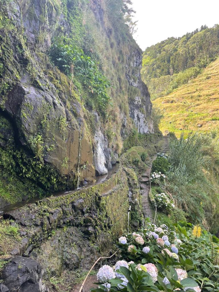 Una de las experiencias más chulas de las Azores fue hacer un par de rutas de senderismo que nos recomendaron. Era el tipo de plan que nos apetecía en este viaje «slow» y que te recomendamos si estás más de 5 días en Sao Miguel. Os aseguro que las rutas que hicimos no requieren un esfuerzo excesivo y aunque están calificadas de dificultad media si vas con zapatillas de deporte y estás acostumbrado a andar no te van a suponer mucho esfuerzo. Ese día comenzamos aparcando en Caldeiras de Ribeira Grande, junto al Restaurante Caldeiras donde aprovechamos para reservar para el almuerzo. La ruta comienza junto al parking, donde puedes ver los huecos para las ollas del cocido que se hace con el vapor de agua. Sigues por una pista de tierra hasta encontrarte con una tubería que te marca un camino entre la vegetación con el que alucinarás. Pasas un puente junto a una antigua central hidroeléctrica y desde ahí comienzas atravesar el cañón entre las rocas para bajar una escalinata que te lleva directamente al chapuzón en el Salto do Cabrito. También se puede llegar directamente con el coche a un parking junto a la cascada, pero hacer la ruta si tienes tiempo es una pasada. La ruta oficial es circular (puedes encontrar el recorrido completo aquí). Nosotros hicimos el círculo completo pero es cierto que el camino que continúa de Salto de Cabrito de vuelta a Caldeiras de Ribeira Grande es menos interesante e incluso pasa demasiado tiempo junto a la carretera. Si lo volviera a hacer probablemente desharía el camino. Nosotros tardamos un poco más de 2 horas y media, baño incluído, y al final tuvimos la recompensa de una buena comilona en Restaurante Caldeiras que a pesar de su aspecto sencillo fue uno de los sitios en los que mejor comimos de la isla y a muy buen precio. Combinamos esta ruta en el mismo día con la visita al Centro de Interpretação Ambiental da Caldeira Velha pero su cercanía a Ribeira Grande, la Costa Norte, Furnas y otros puntos de interés te permiten compaginarlo con el itinerario que más te convenga.