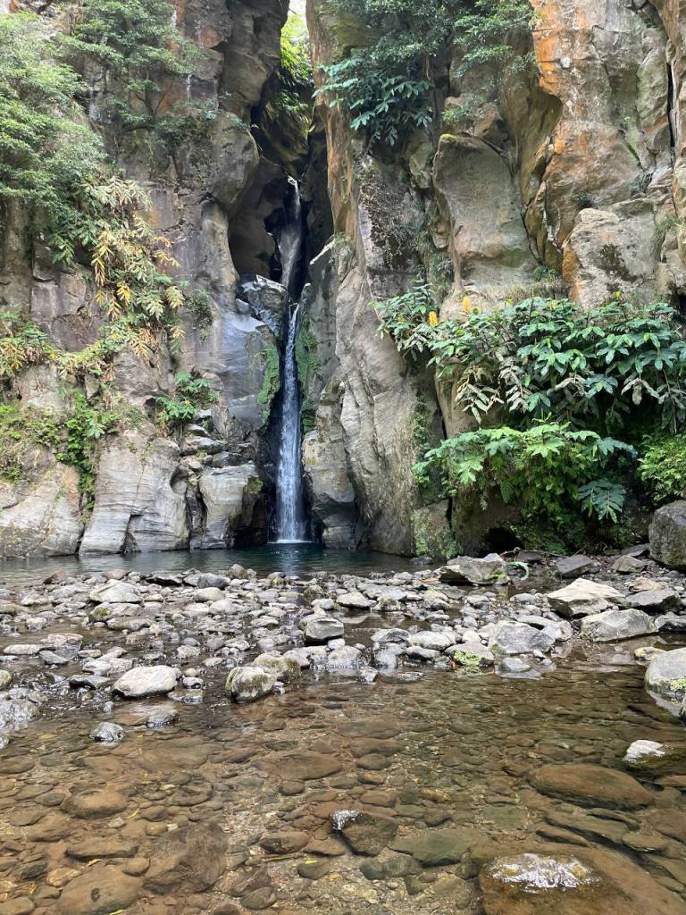 Esta fue mi ruta favorita de todo el viaje. Debes aparcar el coche en este punto donde encontrarás un cartel que te da información de toda la ruta, que es circular. Si sigues las indicaciones de Poço azul irás directamente a la poza pero te recomendamos ir en el sentido contrario (tal y como indica la ruta completa) siguiendo la calle principal del pueblo hasta que llegas al Café Tavares y comienzas una bajada a la playa, pasas por este merendero desde el que hay unas vistas espectaculares de la costa y aquí empiezas a alucinar: un precioso camino lleno de hortensias, arroyos y pequeños saltos de agua hasta que llegas a la solitaria Cascada do Risco, donde pegarte un chapuzón. Coge fuerzas porque la subida al Poço azul es un poco durilla pero, sin duda, vale la pena probar para sus frías aguas. De ahí otro camino a la Cascada Salto da Farinha que está junto a una de las playas más tranquilas y espectaculares de Sao Miguel. Después tienes que deshacer parte del camino hasta llegar de nuevo al parking. En total son poco más de 3 horas de una ruta muy entretenida y con varios puntos donde refrescarte.