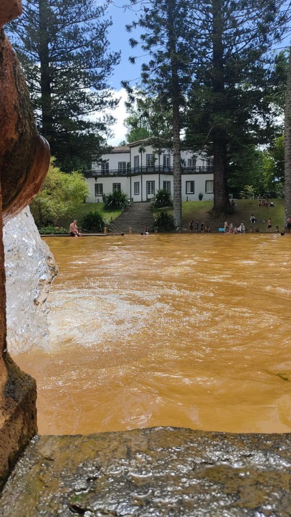 Nuestro día comenzó en el Mirador de Pico de Ferro un punto en alto desde el que poder ver todo lo que íbamos a visitar después. De ahí bajamos al valle de Furnas y comenzamos la jornada en el Jardín botánico de Terra Nostra. Es importante tener en cuenta su horario. Abre de 10 a 16 horas por eso te recomiendo visitarlo a primera hora de la mañana. La entrada vale 10 euros. Se trata de un impresionante jardín botánico por el que pasear pero su principal atractivo es poder bañarte en la enorme piscina termal que hay en el centro del mismo. El agua está a más de 30 grados. Te recomiendo llevar un bañador al que no le tengas mucho cariño porque las aguas ferruginosas dejan manchas en el textil. Después de pasar unas tres horas en este sitio nos fuimos a comer. Lo hicimos en el restaurante Aguas Quentes que, no es que sea el más glamouroso de Furnas, pero probablemente si uno de los más auténticos. Se veía que era un sitio más para locales que para turistas y comimos el típico cocido de Furnas que se hace a fuego lento durante toda la noche en las fumarolas volcánicas que hay junto al lago. La comida fue baratísima porque el propietario nos advirtió que la ración de cocido era enorme y nos recomendó compartir. Estos son los detalles que se agradecen.