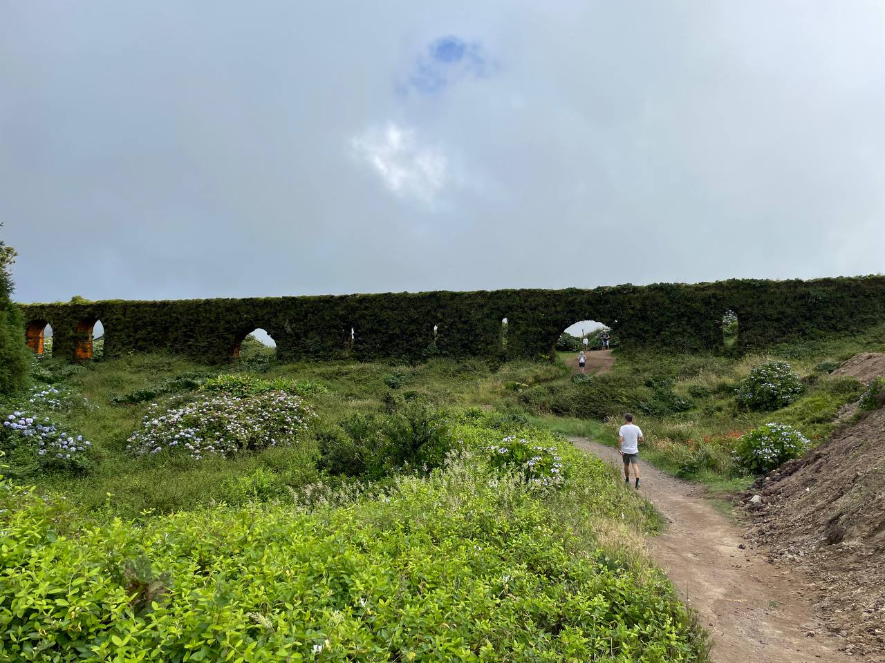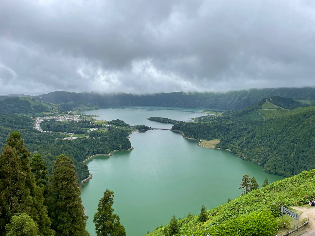 Nuestro primer día completo en la isla lo decidimos comenzar en uno de los lugares imprescindibles de Sao Miguel: la icónica imagen de los lagos de Sete Cidades y toda la explosión de naturaleza que encontrarás en los múltiples puntos de interés que hay alrededor. Tomamos nuestro coche y en menos de 20 minutos estábamos en nuestro primer destino, el Acueducto do Carvao, donde dejamos el coche y cruzamos la carretera. A tan solo 10 minutos caminando te encontrarás la impresionante Lagoa das Empadadas y a continuación la Lagoa de Eguas. Desde este punto comienza una ruta de senderismo que te lleva a Pico do Paul y de allí a Lagoa do Canario, pero nosotros no la hicimos. En nuestro caso tomamos el coche de nuevo para dirigirnos primero al acueducto das Nove Janelas y de allí al parking de Lago de Canario. Desde el parking encuentras un camino cerrado al tráfico que te dirige primero a la laguna y luego al Miradouro da Grota do Inferno y aquí es donde entró en escena uno de los enemigos de nuestro viaje: la niebla. Este y otros miradores están a gran altitud y en muchas ocasiones la niebla te estropeará las vistas. Nos habían hablado de las web cam en directo que te dan pistas de si vas a encontrar o no niebla. Nuestra experiencia en Gruta del Infierno, sin embargo, fue que la paciencia es la madre de la ciencia… Aunque llegamos al mirador con una niebla cerrada solo tuvimos que esperar unos minutos para que las nubes se despejaran y nos dejaran ver algunas de las lagunas, como la de Santiago, desde arriba.