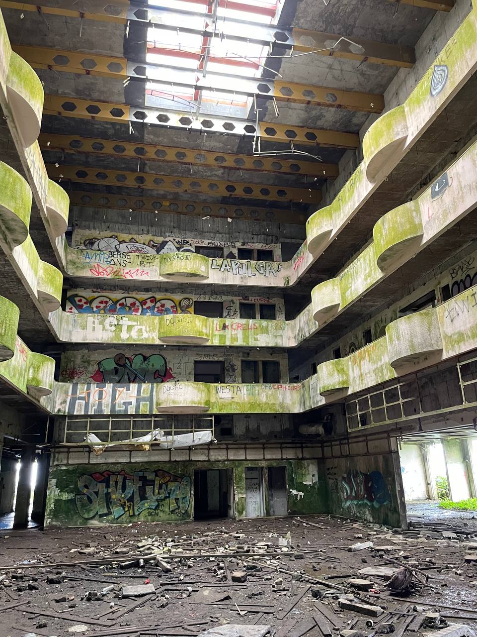 De regreso al parking de Lago de Canario tomamos el coche de nuevo y condujimos muy pocos kilómetros para encontrarnos la vista más emblemática de la isla: el Mirador de Vista do Rei, que ofrece las visión más increíble sobre Sete Cidades y sus dos lagos (azul y verde). Este es uno de los puntos en los que probablemente encontrarás muchos coches y verás que el primer parking (en cuesta e incómodo) está hasta arriba, así que te recomiendo aparcar mejor en este otro parking. Junto a él te encontrarás las míticas ruinas del Monte Palace Hotel, un lujoso complejo hotelero que cerró sus puertas en los primeros 2000 y que la naturaleza se ha comido por dentro. Con precaución se puede entrar y ver el impresionante patio central y subir a las habitaciones y a la azotea para admirar las vistas.