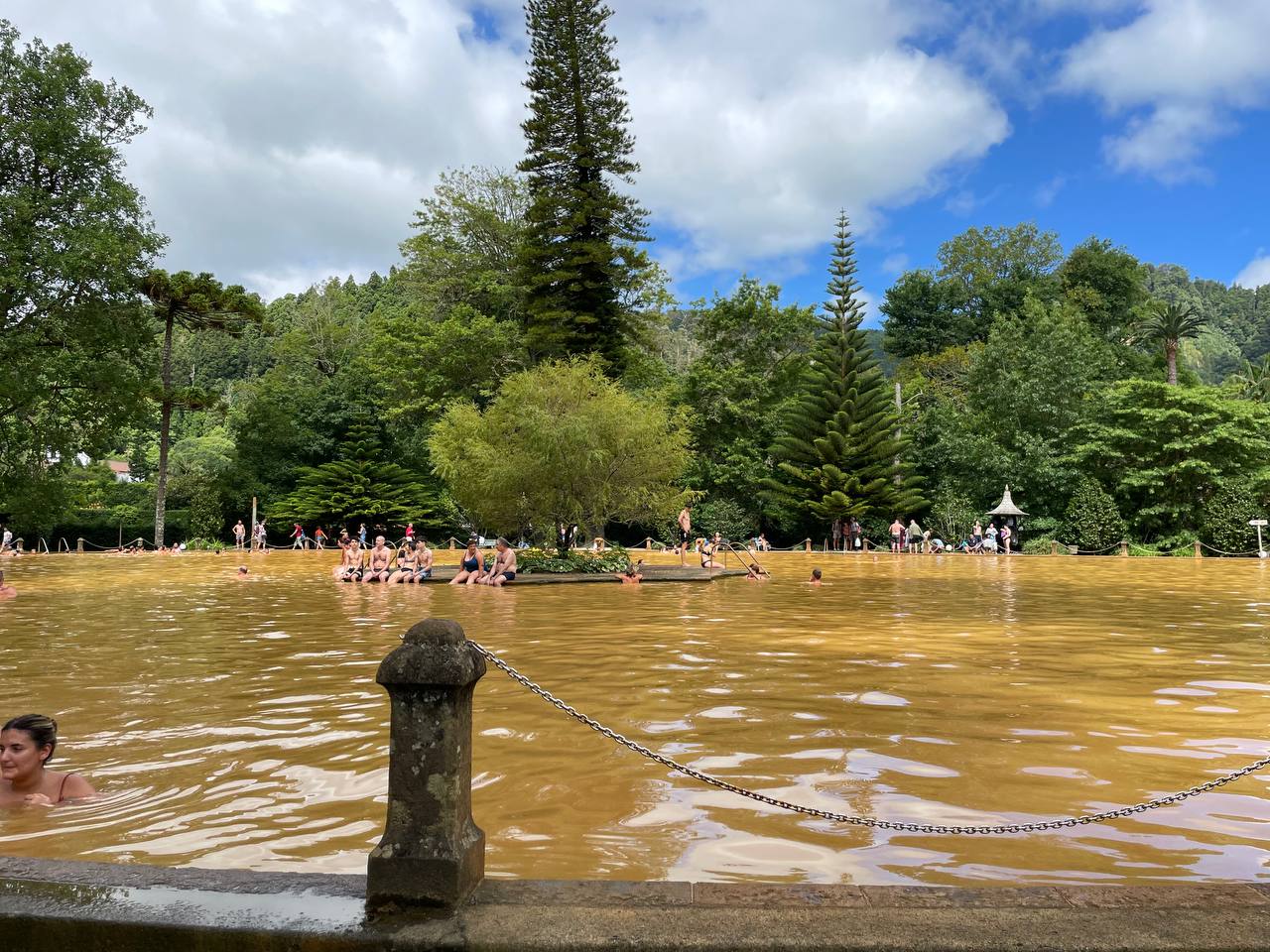 Nuestro día comenzó en el Mirador de Pico de Ferro un punto en alto desde el que poder ver todo lo que íbamos a visitar después. De ahí bajamos al valle de Furnas y comenzamos la jornada en el Jardín botánico de Terra Nostra. Es importante tener en cuenta su horario. Abre de 10 a 16 horas por eso te recomiendo visitarlo a primera hora de la mañana. La entrada vale 10 euros. Se trata de un impresionante jardín botánico por el que pasear pero su principal atractivo es poder bañarte en la enorme piscina termal que hay en el centro del mismo. El agua está a más de 30 grados. Te recomiendo llevar un bañador al que no le tengas mucho cariño porque las aguas ferruginosas dejan manchas en el textil. Después de pasar unas tres horas en este sitio nos fuimos a comer. Lo hicimos en el restaurante Aguas Quentes que, no es que sea el más glamouroso de Furnas, pero probablemente si uno de los más auténticos. Se veía que era un sitio más para locales que para turistas y comimos el típico cocido de Furnas que se hace a fuego lento durante toda la noche en las fumarolas volcánicas que hay junto al lago. La comida fue baratísima porque el propietario nos advirtió que la ración de cocido era enorme y nos recomendó compartir. Estos son los detalles que se agradecen.