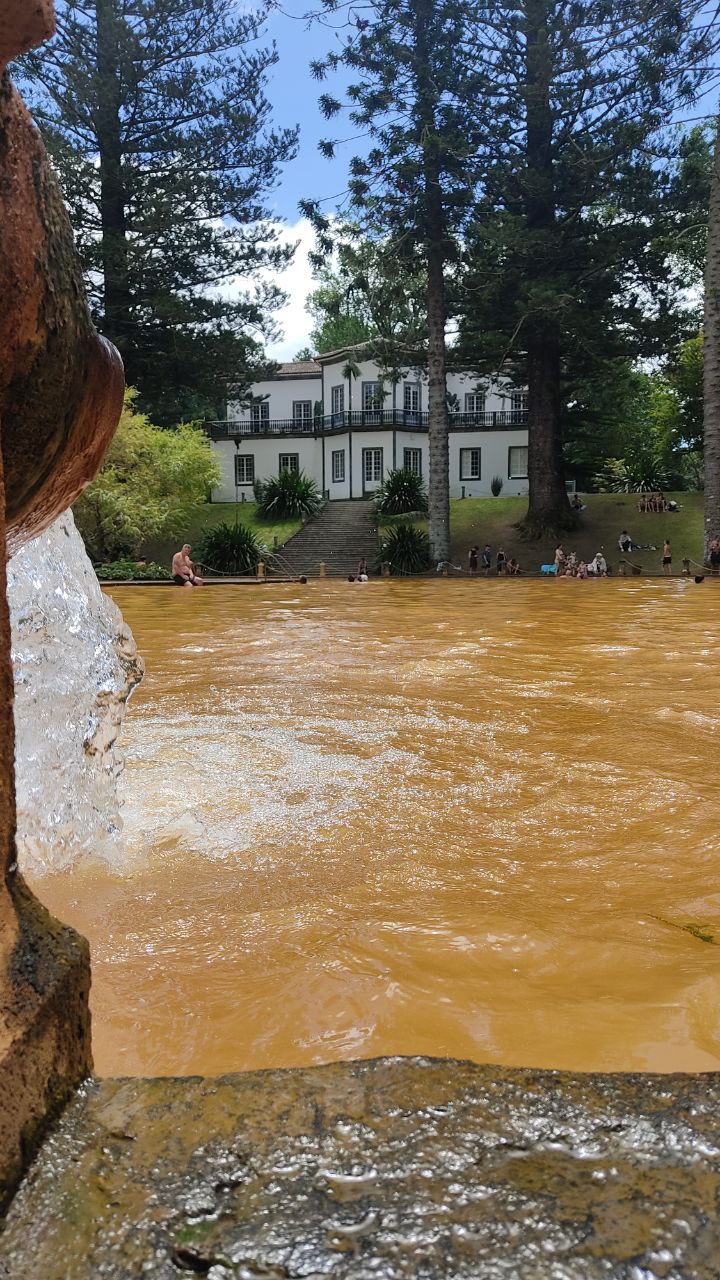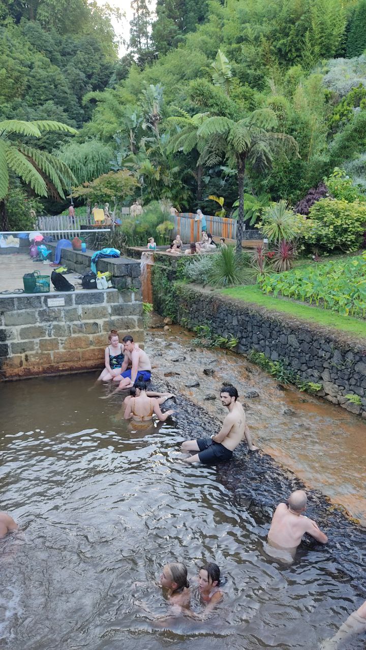 Estábamos cansados y regresamos a Ponta Delgada pero nuestro plan inicial era darnos un baño al atardecer en Poça da Dona Beija unas piscinas termales que abren hasta las 23 horas. Lo hicimos otro día porque esta es una de las experiencias que no te puedes perder. Se trata de un espacio en el centro de Furnas que aprovecha el agua caliente del río para llenar cinco piscinas termales a 39º con distintos tamaños y diseños. En este punto, como en otros de la isla, es una pasada descubrir cómo la arquitectura contemporánea se integra en el paisaje. Si ves cola al llegar no te asustes. No se puede reservar previamente, así que te harán esperar un poco hasta que salgan otros visitantes pero no esperarás más de media hora. La entrada vale 8 euros y te permiten estar un máximo de 90 minutos. Misma recomendación en cuanto a los bañadores, ¡lleva uno viejo! Y no te sorprendas si en los siguientes días por mucho que te duches tus poros siguen expulsando hierro.