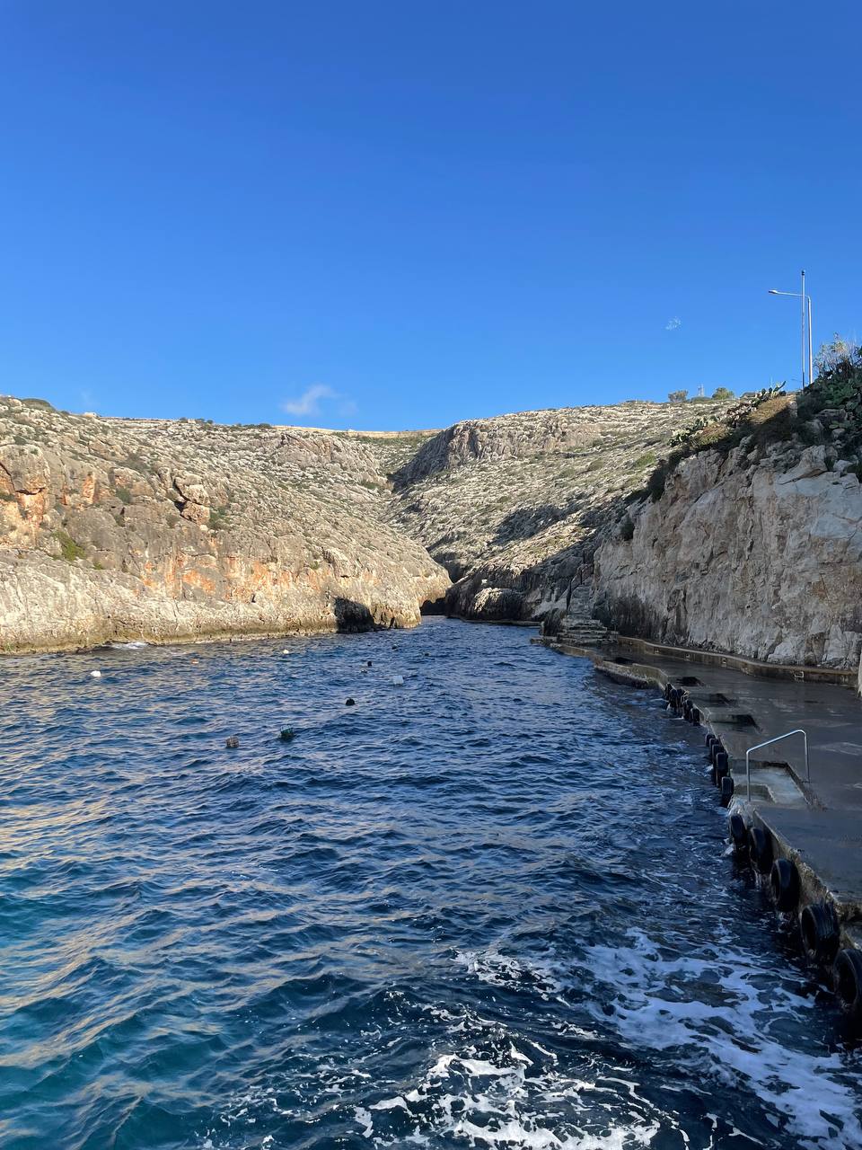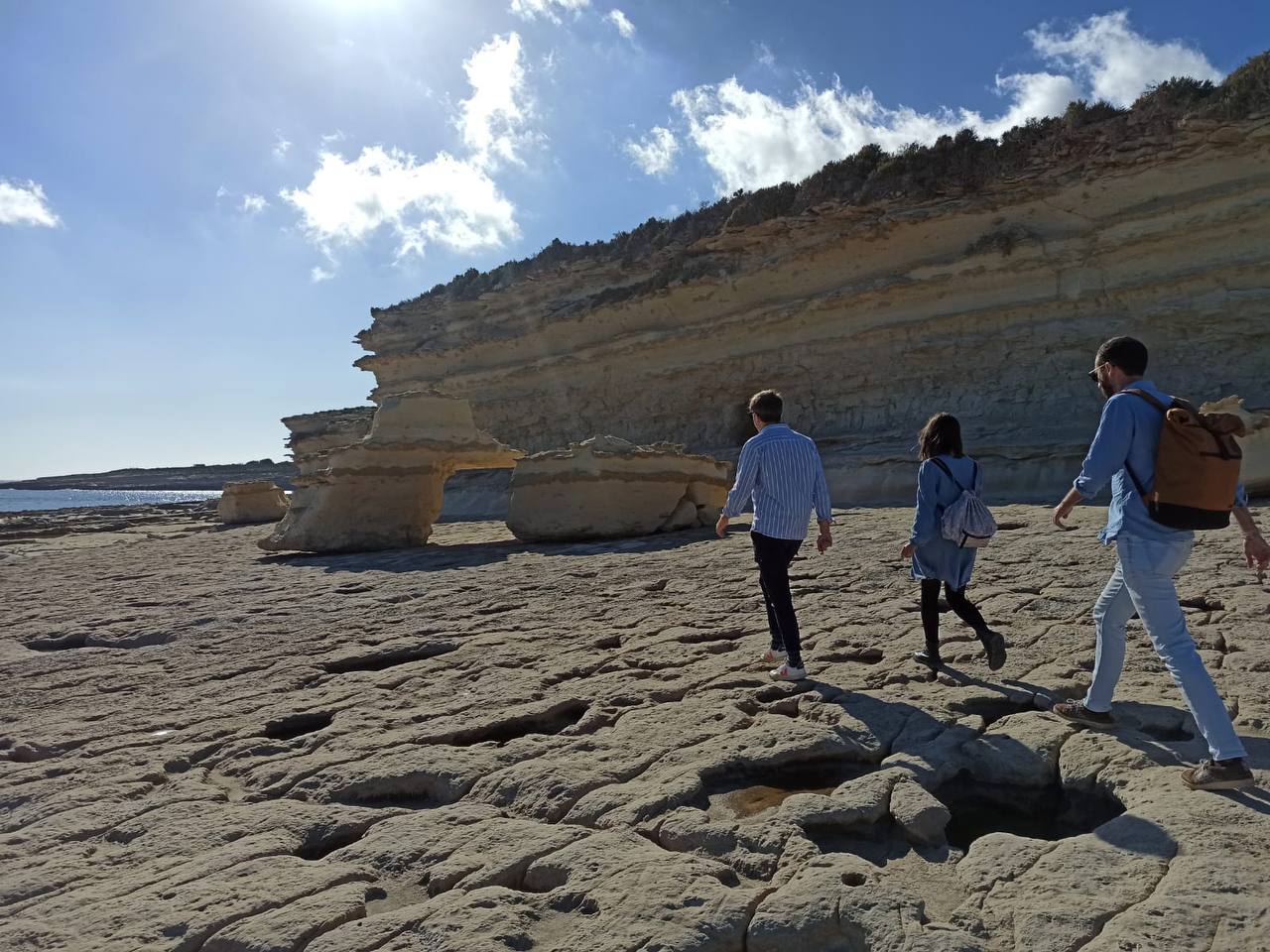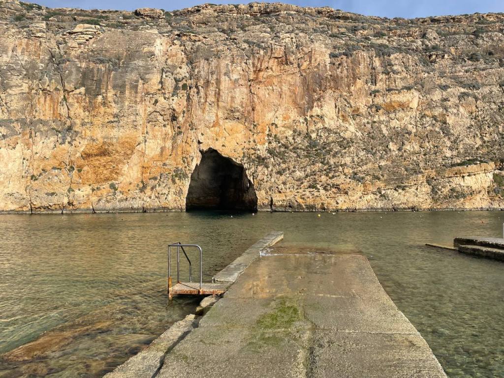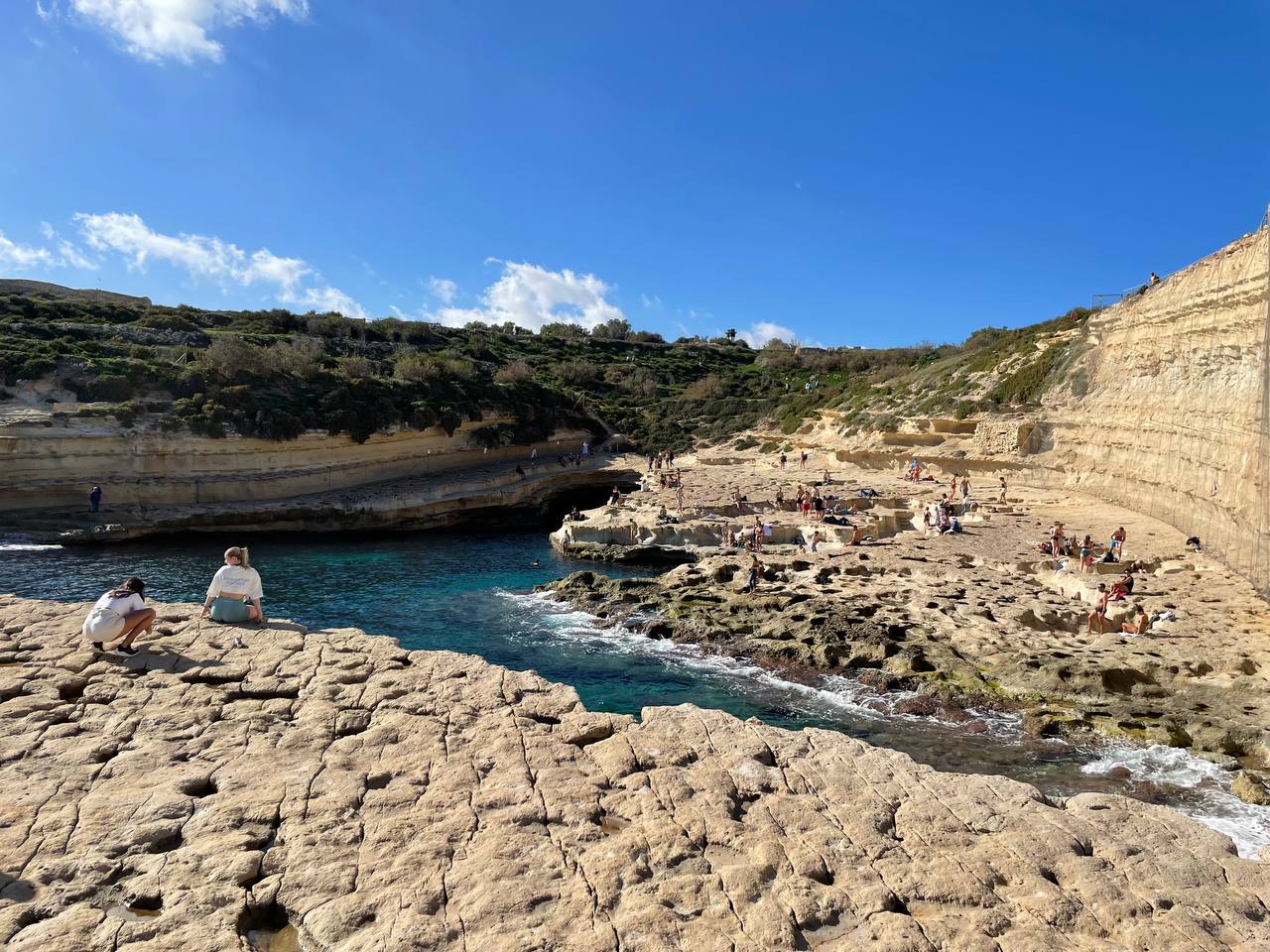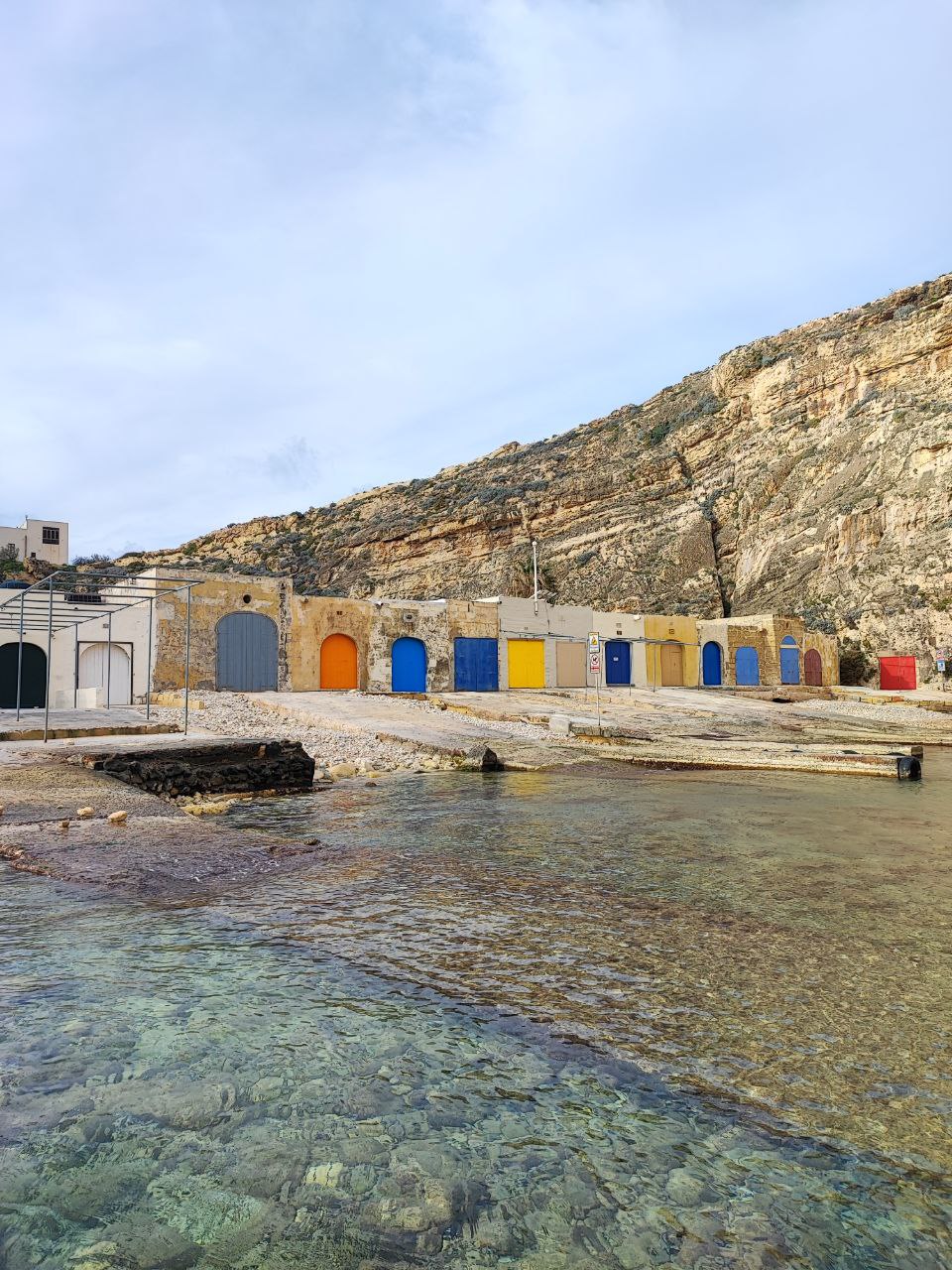 Te cuento la ruta que seguimos ese día y que tuvo mucha naturaleza. Comenzamos la jornada en el mar interior de Dwejra. Es un sitio muy guay donde al menos echarás una hora por todo lo que hay alrededor. Es un pequeño pueblo pesquero interior que se comunica con el mar abierto a través de una cueva. Desde allí parten paseos en barco que te llevan por la costa. A 5 minutos caminando están las piscinas naturales de Blue Hole y se pueden ver los restos de la Azure Window que en 2017 colapsó en una tormenta. De ahí fuimos dando un paseito por la bahía con unas impresionantes vistas de acantilados hasta llegar a esta miniplaya de San Lawrence con unos pequeños almacenes para pescadores y embarcaderos muy curiosos.