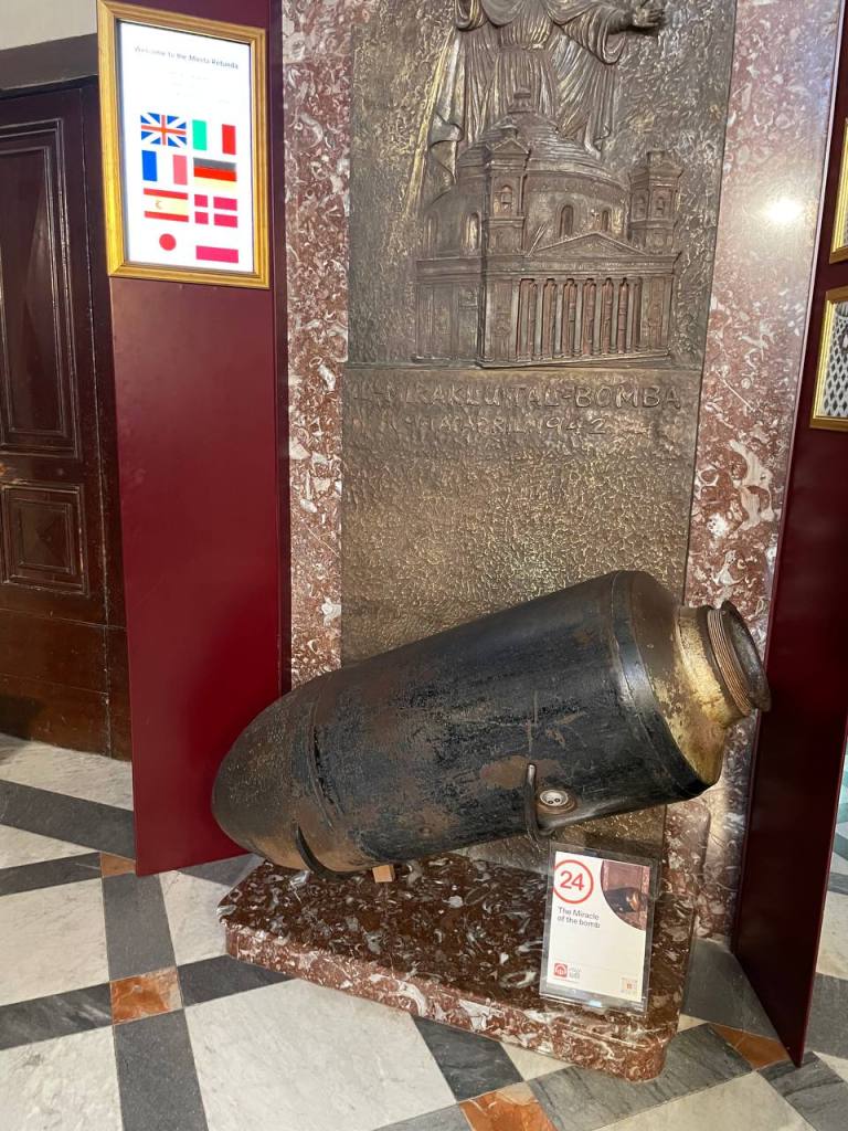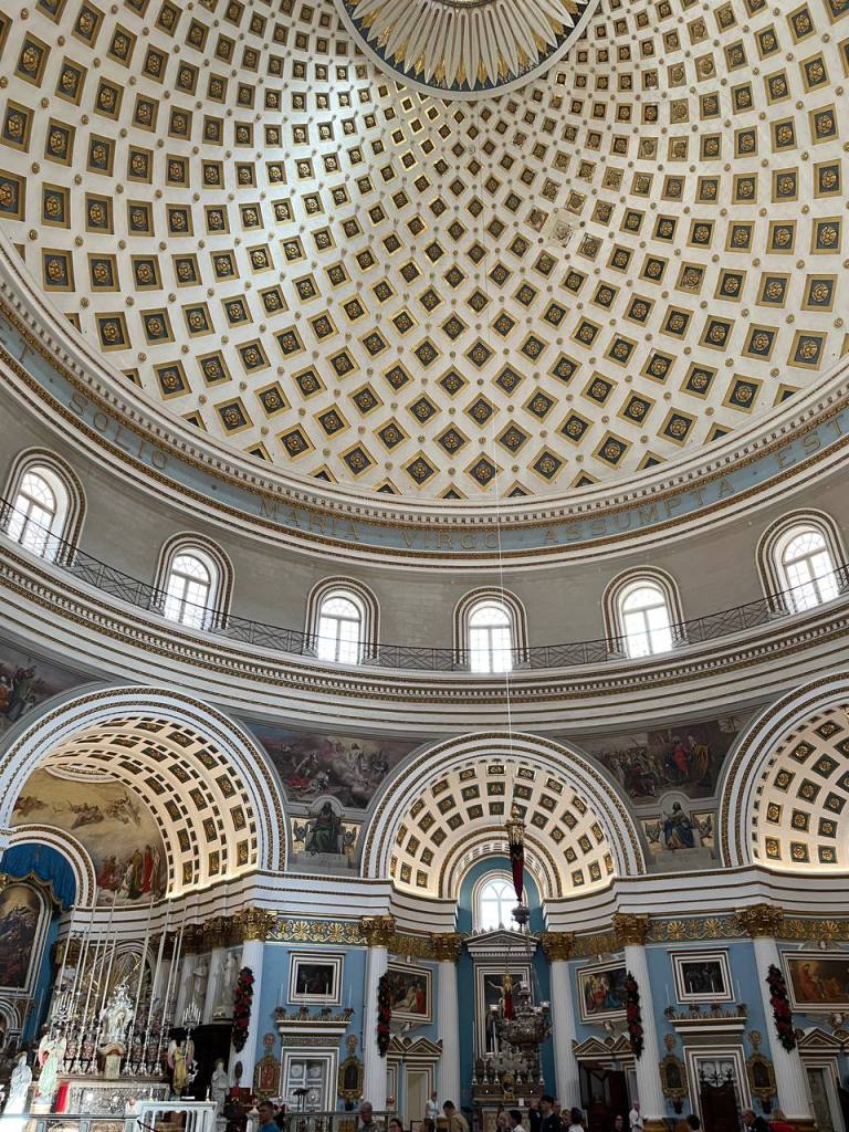 Después de la Valeta los puntos más visitados de la Isla se encuentran a menos de 20 minutos de la capital y muy cerca los unos de los otros. Te cuento la ruta que nosotros hicimos y que empezó en Mosta, una ciudad reconocible por la enorme cúpula de su iglesia que puede verse casi desde cualquier punto de Malta. La entrada cuesta 5 euros y te permite subir a la cúpula, ver el interior de la iglesia y el pequeño museo de la Sacristía donde se encuentra el misil que milagrosamente no explotó pero que dejó una huella todavía visible en el techo. También se puede bajar a los refugios de la II Guerra Mundial que están musealizados para entender mejor la resistencia del pueblo maltés.