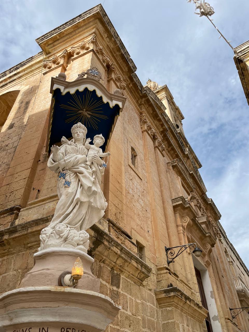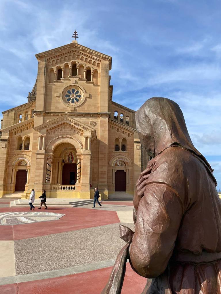 Desde allí cogimos de nuevo el coche para explorar la costa opuesta (apenas 15 minutos conduciendo de un extremo a otro) no sin antes pasar por el famosísimo Santuario Nacional de la Virgen de Ta ‘Pinu, la versión maltesa de Lourdes, el Rocío o Fátima, un centro de peregrinaje muy curioso. Se puede ver la explanada exterior con paneles de mosaicos, la iglesia y una sacristía repleta de ex votos con peticiones para la virgen. Si vas en coche vas a ver esta iglesia todo el tiempo dominando el paisaje y en algún momento te detendrás para visitarla.