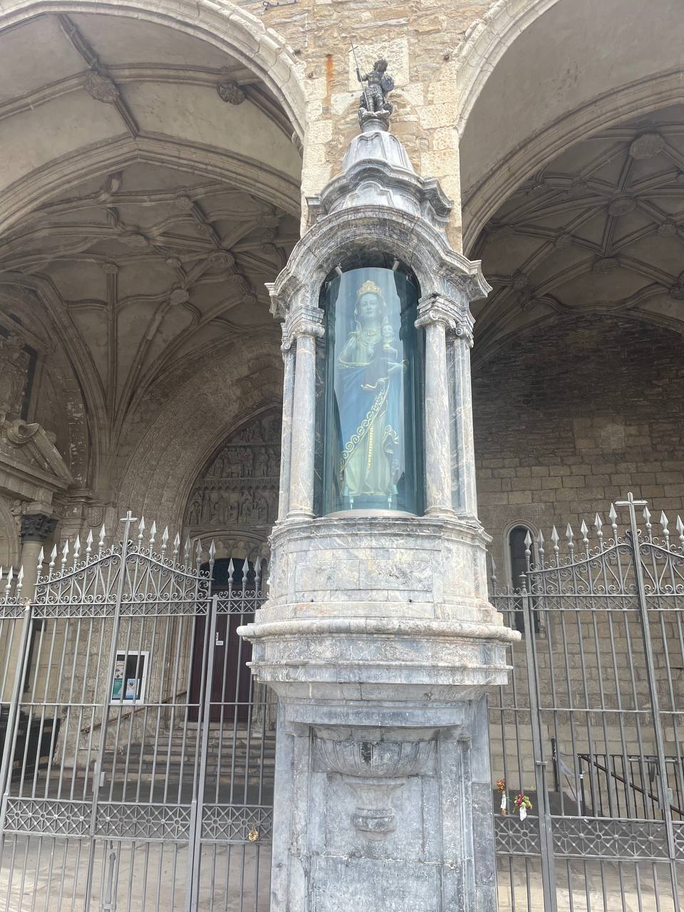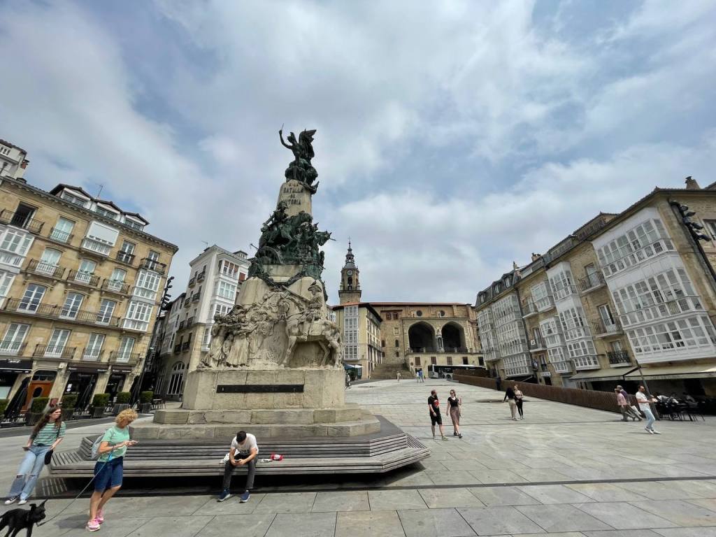 La entrada tradicional al caso histórico es a través de la icónica Plaza de la Virgen, un enorme espacio urbano en el que te recibe una escultura vegetal con el nombre de la ciudad en castellano y euskera. Al fondo de la plaza, cerrando la perspectiva, la iglesia de San Miguel Arcángel, en cuyo pórtico está precisamente la hornacina de la patrona de la ciudad, la Virgen Blanca. Entrar a la iglesia es gratuito y vale la pena para disfrutar de su increíble arquitectura gótica. Junto a la puerta, la escultura del Celedón, el personaje que desciende en forma de muñeco desde la torre de la iglesia a la plaza y marca así el inicio de las fiestas patronales.