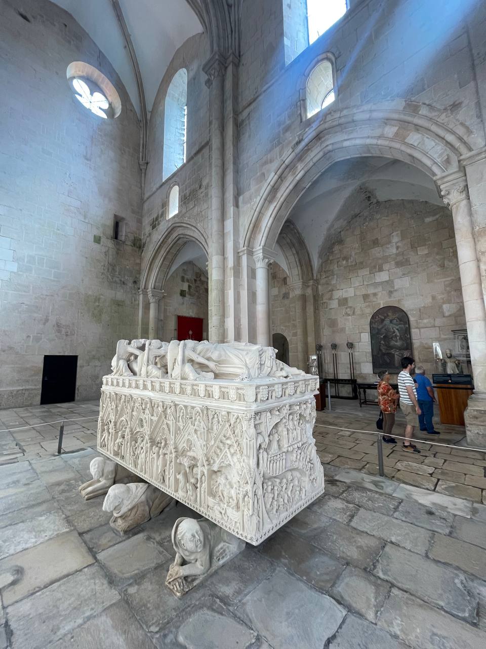 El tercer vértice de este triángulo monumental está en Alcobaça, un coqueto pueblo donde se unen los rios Alcoa y Baça. Y este símbolo fluvial no puede venirle mejor a la localidad porque su impresionante monasterio acoge las tumbas de Pedro I e Inés de Castro, los Romeo y Julieta lusos. Cuenta la historia, que siendo príncipe Pedro se enamoró de la dama gallega Inés, una relación que no era aceptable para su padre el rey, que ordenó asesinar a la gallega. Cuando Pedro se convirtió en rey se vengó ejecutando a todos los participantes en el asesinado de Inés y la proclamó reina después de muerta, con un funeral de Estado. Hoy los amantes prohibidos descansan eternamente uno frente al otro.