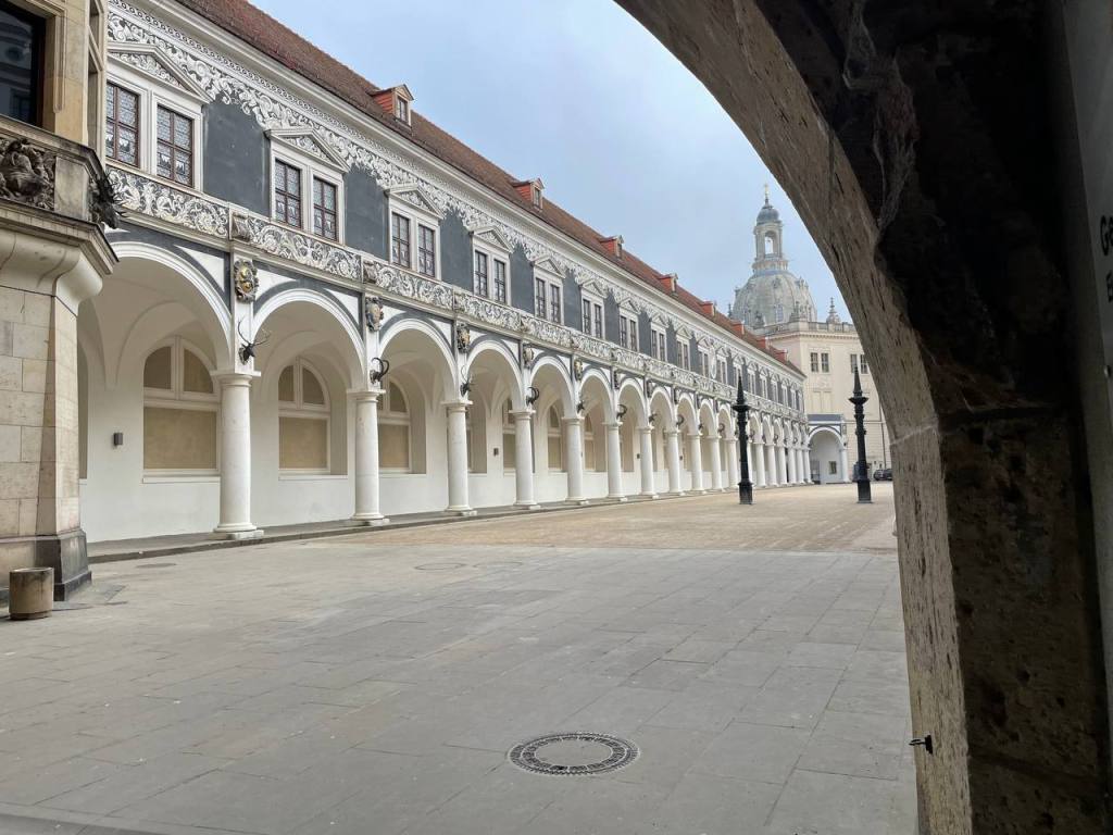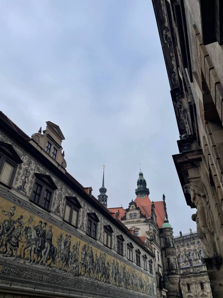El paseo por la terraza termina en una impresionante escalinata desde la que se ve la Plaza del Castillo, enmarcada por el arco de acceso a la antigua residencia de los soberanos de Sajonia y la Catedral de la Santa Trinidad. La entrada al templo es gratuita. A la izquierda de la plaza verás el archiconocido mural del «Desfile de los Príncipes de Dresde«, un inmenso panel de porcelana que resume siglos de Historia de la ciudad representando a todos los gobernantes de la misma desde los soberanos medievales a los políticos del siglo XIX. Se considera, con más de 24.000 azulejos, el mural cerámico más grande del mundo y es prácticamente original porque sobrevivió a los bombardeos de la II Guerra Mundial.