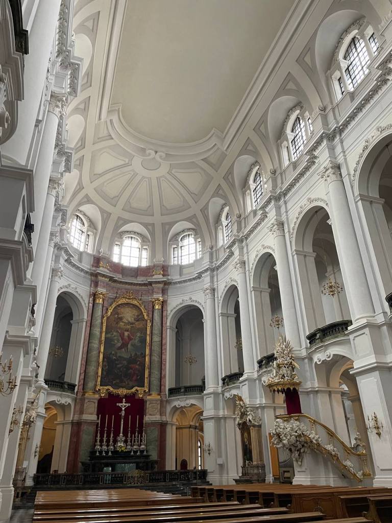 Pero el despligue de monumental barroco de la ciudad viene cruzando la calle. Mi recomendación es que empieces el recorrido por Neumarkt y vayas de Este a Oeste de la zona monumental. Al entrar en esta plaza, lo primero que te encontrarás es el Monumento a Martín Lutero frente a la impresionante Frauenkirche. Esta increíble iglesia, al igual que todo el centro histórico de Dresde, fue totalmente destruida durante los bombardeos aliados de la II Guerra Mundial. Si ves la iglesia desde el exterior observa las piedras más oscuras, son las originales. Todo lo demás es el resultado de una increíble reconstrucción que terminó en los primeros años 2000. Si te digo que toda la impresionante monumentalidad barroca del centro de Dresde es el resultado de una ejemplar recostrucción, quizás te decepcione. Pero, de verdad, estando allí no tienes la sensación de encontrarte en un falso histórico de cartón piedra, si no en una inteligente restauración del esplendor pasado de esta impresionante ciudad. Te recomiendo entrar en la iglesia, es gratis, y su estructura circular con palcos superiores es algo muy original.