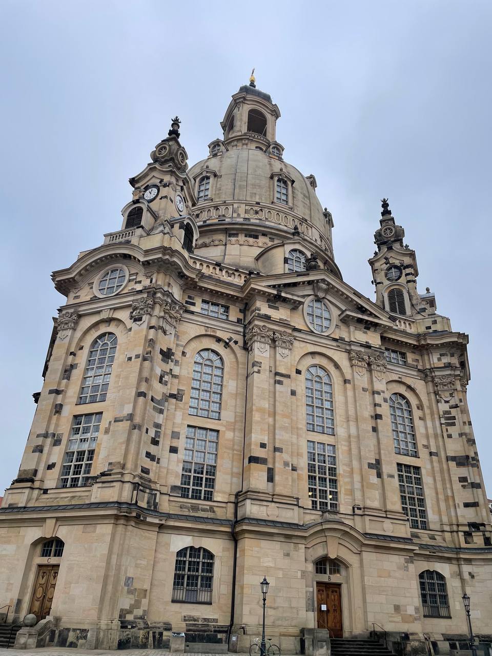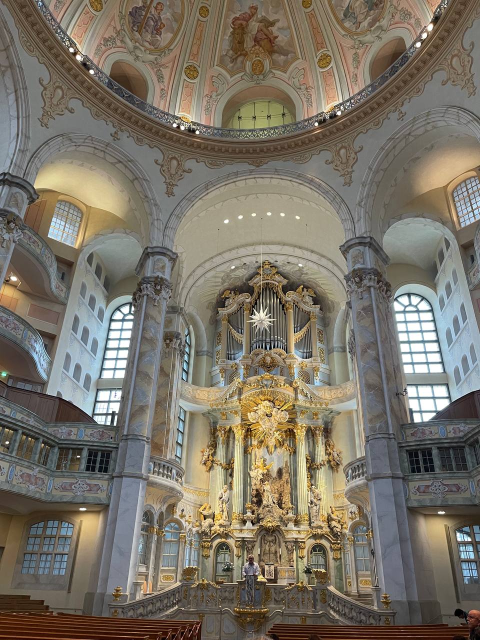 Pero el despligue de monumental barroco de la ciudad viene cruzando la calle. Mi recomendación es que empieces el recorrido por Neumarkt y vayas de Este a Oeste de la zona monumental. Al entrar en esta plaza, lo primero que te encontrarás es el Monumento a Martín Lutero frente a la impresionante Frauenkirche. Esta increíble iglesia, al igual que todo el centro histórico de Dresde, fue totalmente destruida durante los bombardeos aliados de la II Guerra Mundial. Si ves la iglesia desde el exterior observa las piedras más oscuras, son las originales. Todo lo demás es el resultado de una increíble reconstrucción que terminó en los primeros años 2000. Si te digo que toda la impresionante monumentalidad barroca del centro de Dresde es el resultado de una ejemplar recostrucción, quizás te decepcione. Pero, de verdad, estando allí no tienes la sensación de encontrarte en un falso histórico de cartón piedra, si no en una inteligente restauración del esplendor pasado de esta impresionante ciudad. Te recomiendo entrar en la iglesia, es gratis, y su estructura circular con palcos superiores es algo muy original.