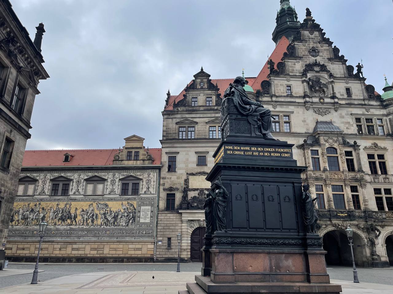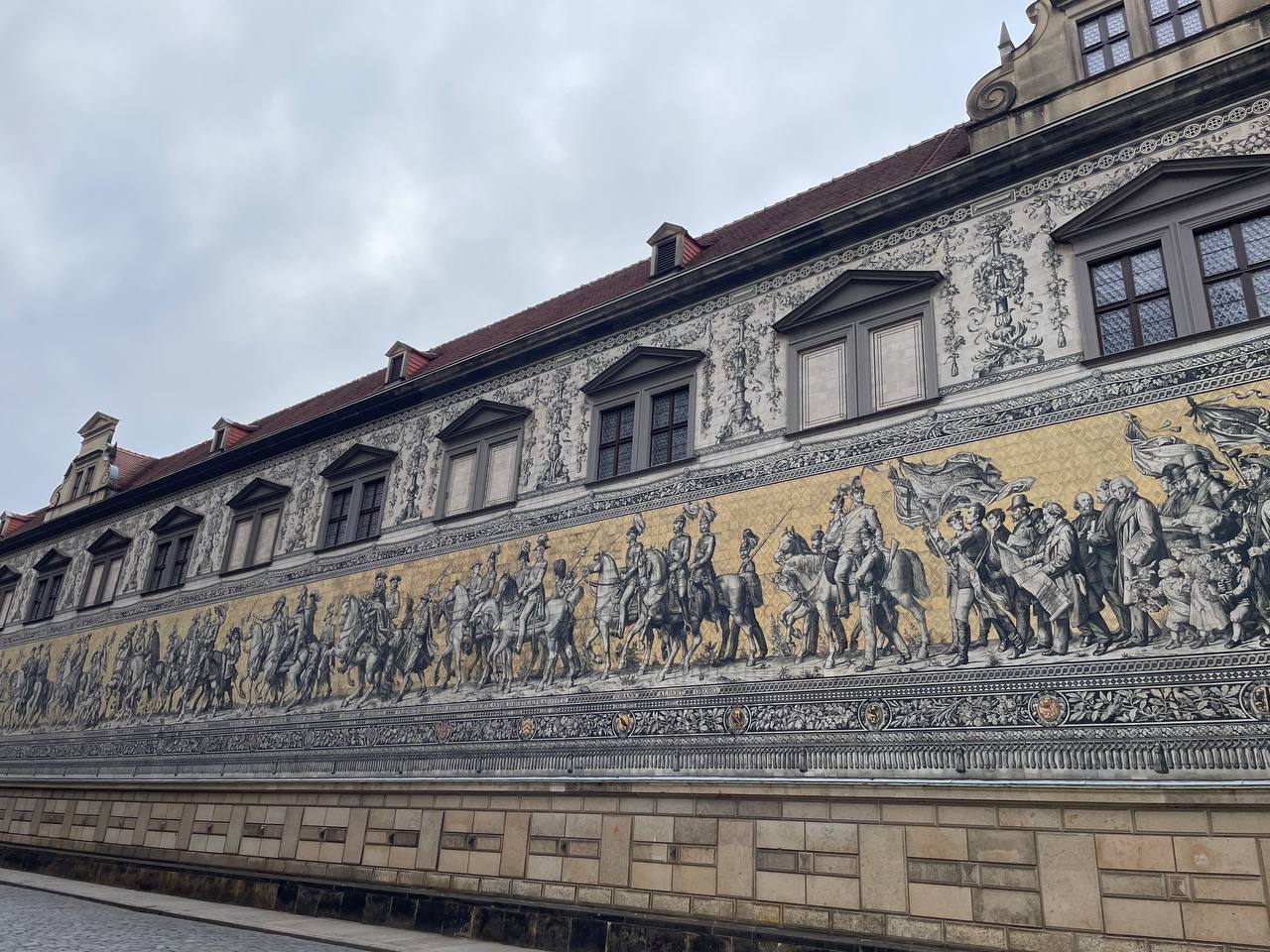 El paseo por la terraza termina en una impresionante escalinata desde la que se ve la Plaza del Castillo, enmarcada por el arco de acceso a la antigua residencia de los soberanos de Sajonia y la Catedral de la Santa Trinidad. La entrada al templo es gratuita. A la izquierda de la plaza verás el archiconocido mural del «Desfile de los Príncipes de Dresde«, un inmenso panel de porcelana que resume siglos de Historia de la ciudad representando a todos los gobernantes de la misma desde los soberanos medievales a los políticos del siglo XIX. Se considera, con más de 24.000 azulejos, el mural cerámico más grande del mundo y es prácticamente original porque sobrevivió a los bombardeos de la II Guerra Mundial.